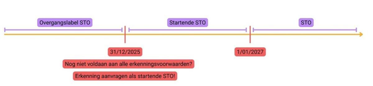Als je tot 31 december 2025 gebruik hebt gemaakt van het overgangslabel STO en na dat overgangsjaar, op 1 januari 2026, nog niet aan al de erkenningsvoorwaarden STO voldoet, dan kan je een erkenning aanvragen als startende STO. Deze erkenning als startende STO is één jaar geldig. We stellen dit graag schematisch voor.